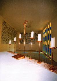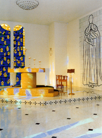 | そして、次にヴァンス村にある、マティスの最後の作となった、「ロザリオ」礼拝堂を訪れました。黄と青のステンドガラスを通して注ぐ微妙な光、あえて顔を描かない神父の絵、世俗の無駄をすべて取り払った配置・・・。そこは心洗われる、純粋な祈りの空間です。(ここも内部写真撮影禁止でしたが、絵葉書からのコピーです。) |