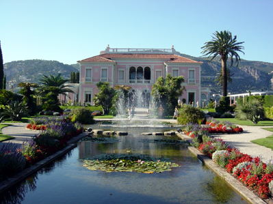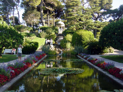 | アンティーブ岬と並んでここフェラ岬にも、大富豪の別荘が立ち並びます。その敷地の広さといったら!!!そして、ここに「世界で一番眺めの良い場所に建てた」というロスチャイルド財閥の邸宅があります。 訪れると、「世界一の眺め」の意味がわかりました。細長い岬の高台にあるこの邸宅から、東に「蟻の湾」、西に風光明媚なことで知られる「ヴィルフランシュ・シュル・メール」の海が広がります。そして、広大な庭は迷子になりそうなほどでした。 |